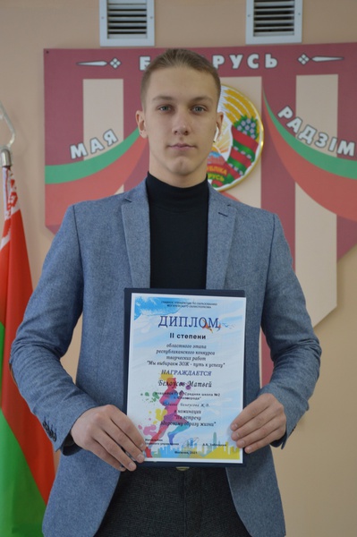 Спорт - это средство, которое позволяет развиваться физически и духовно, достигать новых вершин и самоутвердиться в жизни. Думаю, что понятия «молодежь» и «спорт» не просто взаимосвязаны, они существуют в единой параллели. Осенью 2021 года прошел областной этап республиканского конкурса творческих работ «Мы выбираем ЗОЖ – путь к успеху». Конкурс способствовал формированию у учащихся культуры здорового образа жизни, положительного отношения к собственному здоровью, профилактике асоциального поведения учащихся, повышению уровня информированности по вопросам сохранения и укрепления здоровья, раскрытию творческой индивидуальности и социальной активности учащихся. Конкурс проводился в двух номинациях: «Навстречу здоровому образу жизни» и «Формула успеха – здоровье». Приятно отметить, что в номинации «Навстречу здоровому образу жизни» учащийся 11 «А» класса ГУО "Средняя школа №2 г. Славгорода" Белоусов Матвей был награждён Дипломом II-й степени на областном этапе конкурса, и Дипломом Национального центра художественного творчества детей и молодежи на республиканском этапе конкурса.